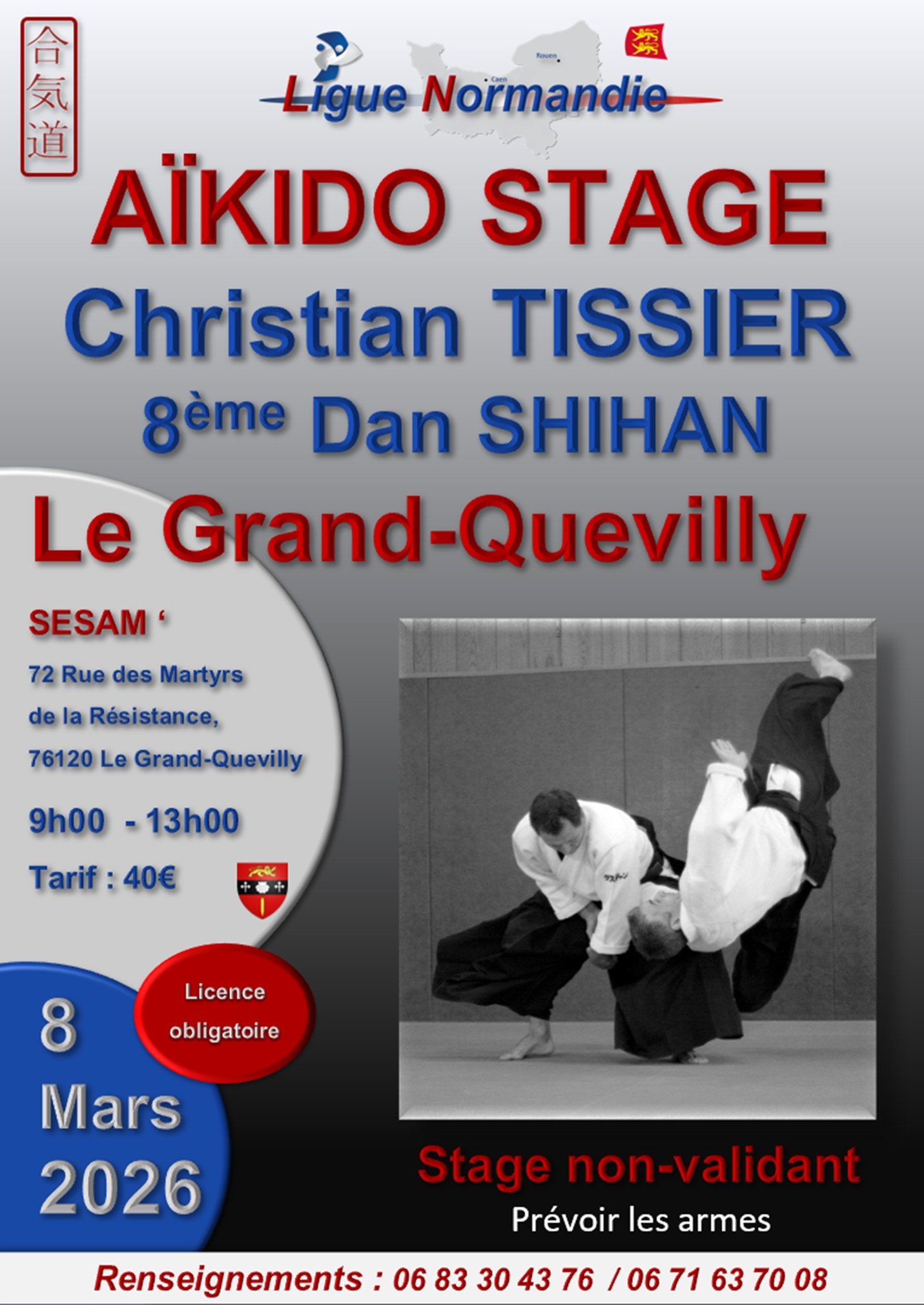 Pour rappel, vous trouverez ci-jointe l'affiche du stage animé par Christian Tissier 8ème Dan Shihan à Rouen le dimanche 8 mars 2026.